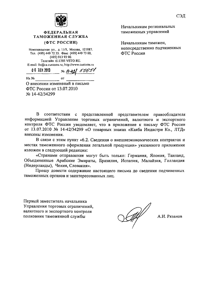 "О ВНЕСЕНИИ ИЗМЕНЕНИЙ В ПИСЬМО ФТС РОССИИ ОТ 13.07.2010 N 14-42/34299"
