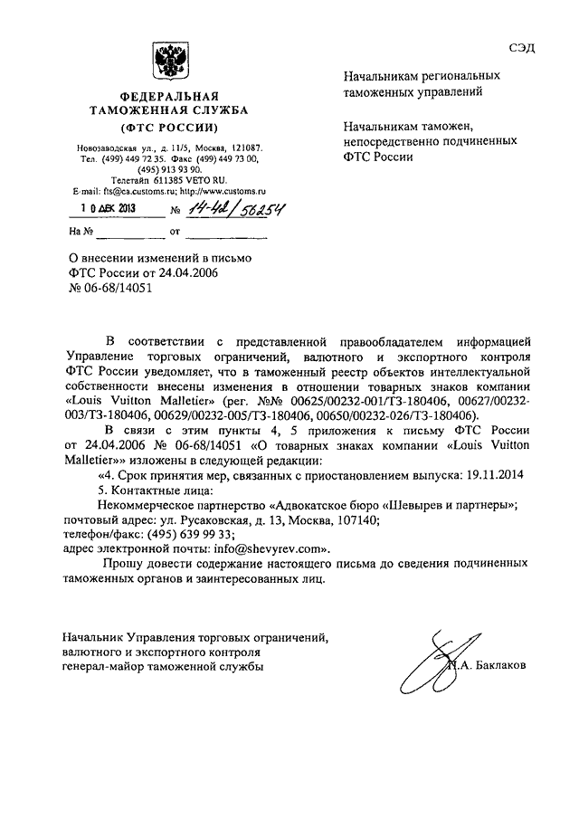 ПИСЬМО ФТС РФ от 10.12.2013 N 14-42/56254