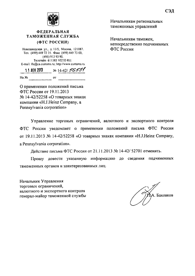 "О ПРИМЕНЕНИИ ПОЛОЖЕНИЙ ПИСЬМА ФТС РОССИИ ОТ 19.11.2013 N 14-42/52258 "О ТОВАРНЫХ ЗНАКАХ КОМПАНИИ "H.J.HAINZ COMPANY, A PENNSYLVANIA CORPORATION"
