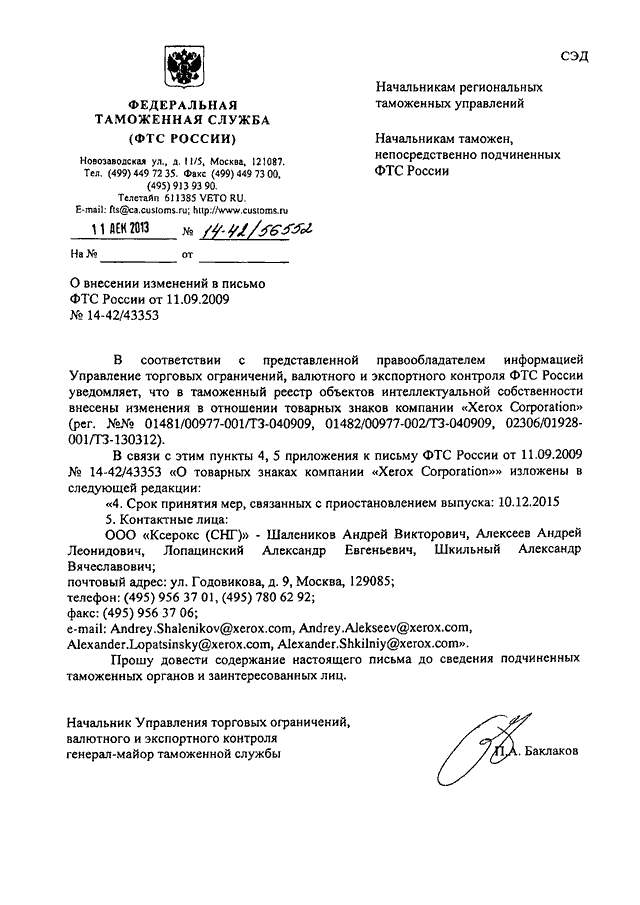 "О ВНЕСЕНИИ ИЗМЕНЕНИЙ В ПИСЬМО ФТС РОССИИ ОТ 11.09.2009 N 14-42/43353"