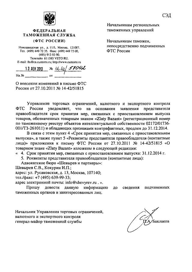 ПИСЬМО ФТС РФ от 13.12.2013 N 14-42/57042