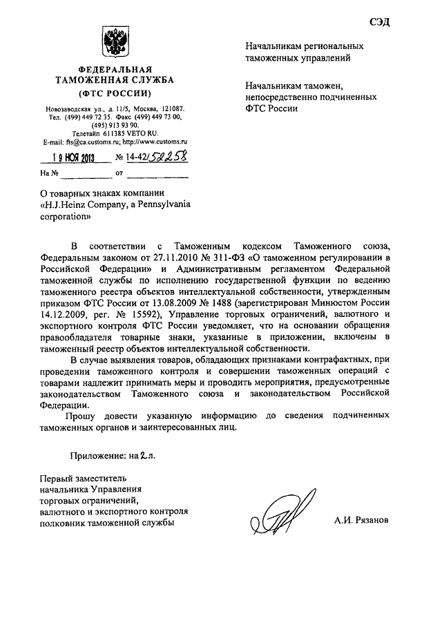 ПИСЬМО ФТС РФ от 19.11.2013 N 14-42/52258