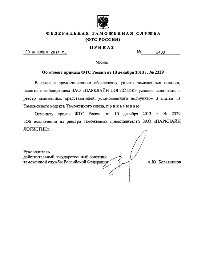 "ОБ ОТМЕНЕ ПРИКАЗА ФТС РОССИИ ОТ 10 ДЕКАБРЯ 2013 Г. N 2329"