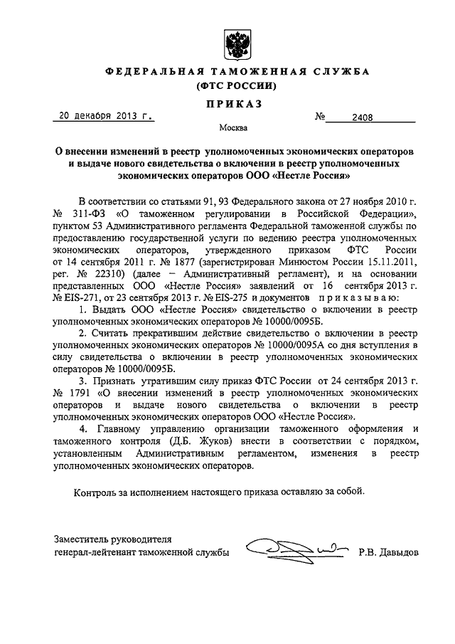"О ВНЕСЕНИИ ИЗМЕНЕНИЙ В РЕЕСТР УПОЛНОМОЧЕННЫХ ЭКОНОМИЧЕСКИХ ОПЕРАТОРОВ И ВЫДАЧЕ НОВОГО СВИДЕТЕЛЬСТВА О ВКЛЮЧЕНИИ В РЕЕСТР УПОЛНОМОЧЕННЫХ ЭКОНОМИЧЕСКИХ ОПЕРАТОРОВ ООО "НЕСТЛЕ РОССИЯ"