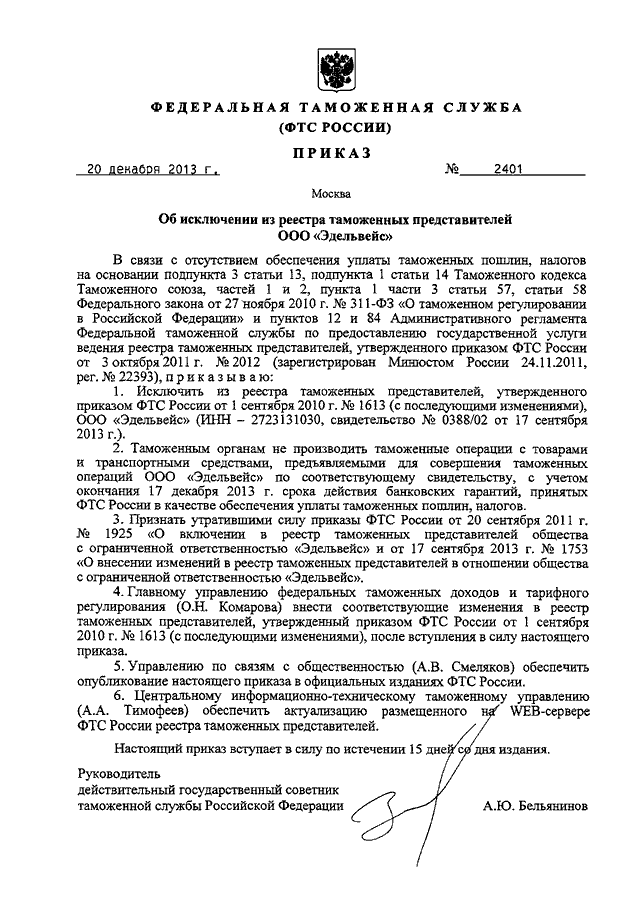 ПРИКАЗ ФТС РФ от 20.12.2013 N 2401