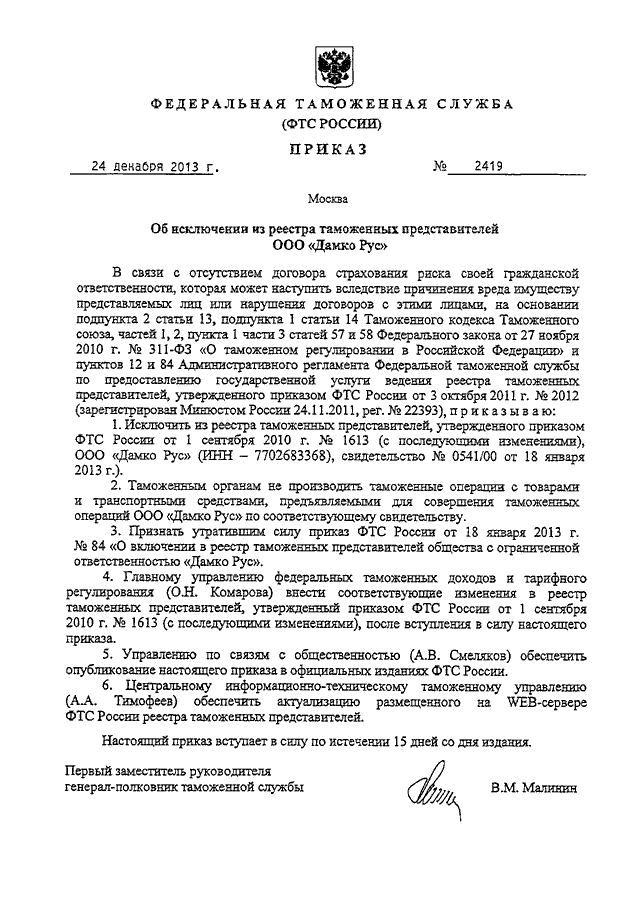 ПРИКАЗ ФТС РФ от 24.12.2013 N 2419