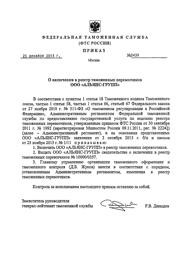 "О ВКЛЮЧЕНИИ В РЕЕСТР ТАМОЖЕННЫХ ПЕРЕВОЗЧИКОВ ООО "АЛЬЯНС-ГРУПП"