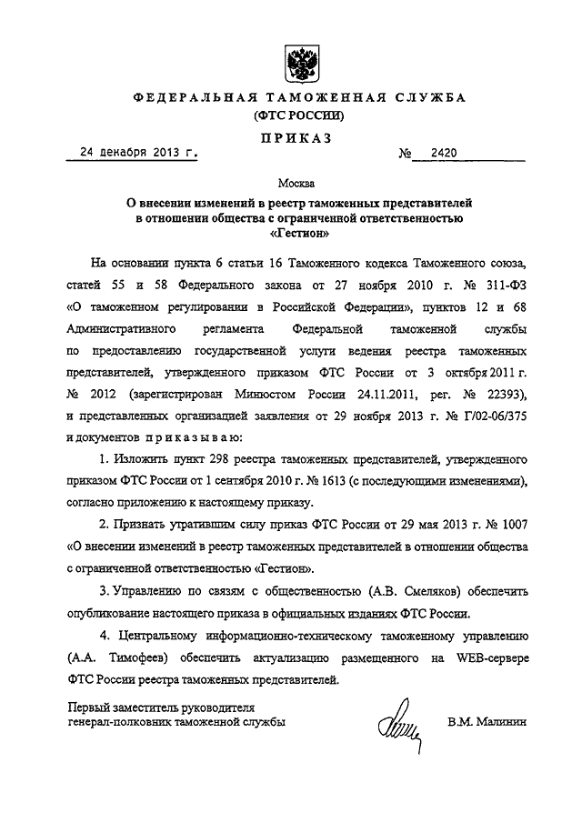 ПРИКАЗ ФТС РФ от 24.12.2013 N 2420