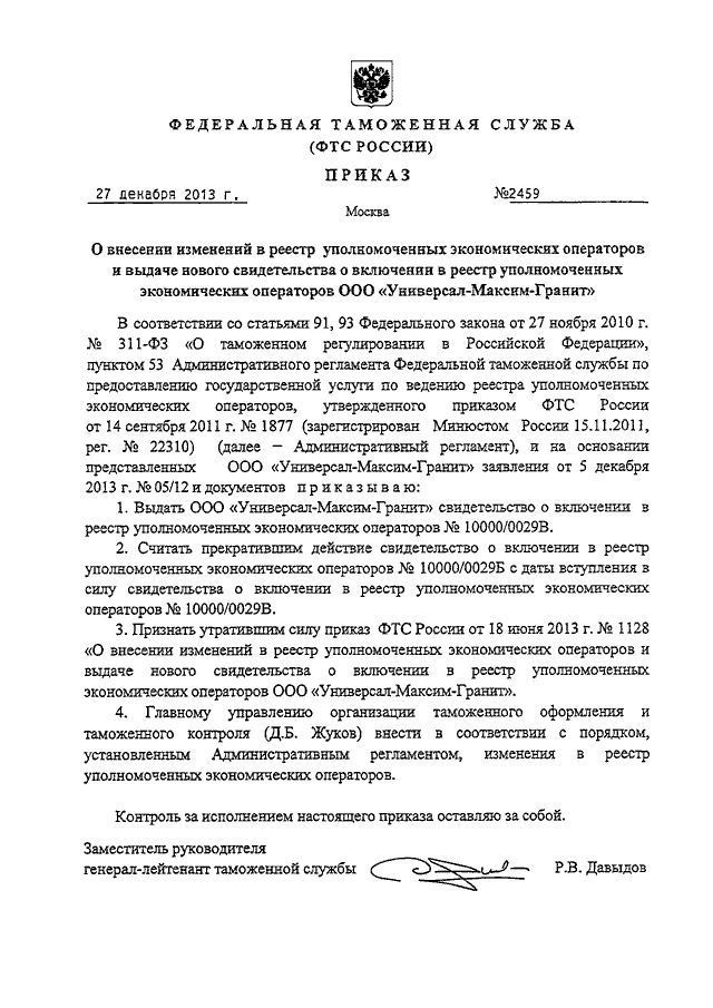 "О ВНЕСЕНИИ ИЗМЕНЕНИЙ В РЕЕСТР УПОЛНОМОЧЕННЫХ ЭКОНОМИЧЕСКИХ ОПЕРАТОРОВ И ВЫДАЧЕ НОВОГО СВИДЕТЕЛЬСТВА О ВКЛЮЧЕНИИ В РЕЕСТР УПОЛНОМОЧЕННЫХ ЭКОНОМИЧЕСКИХ ОПЕРАТОРОВ ООО "УНИВЕРСАЛ-МАКСИМ-ГРАНИТ"
