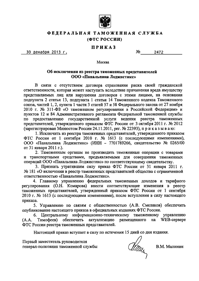 "ОБ ИСКЛЮЧЕНИИ ИЗ РЕЕСТРА ТАМОЖЕННЫХ ПРЕДСТАВИТЕЛЕЙ ООО "ПАНАЛЬПИНА ЛОДЖИСТИКС"