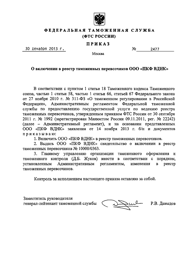 ПРИКАЗ ФТС РФ от 30.12.2013 N 2477