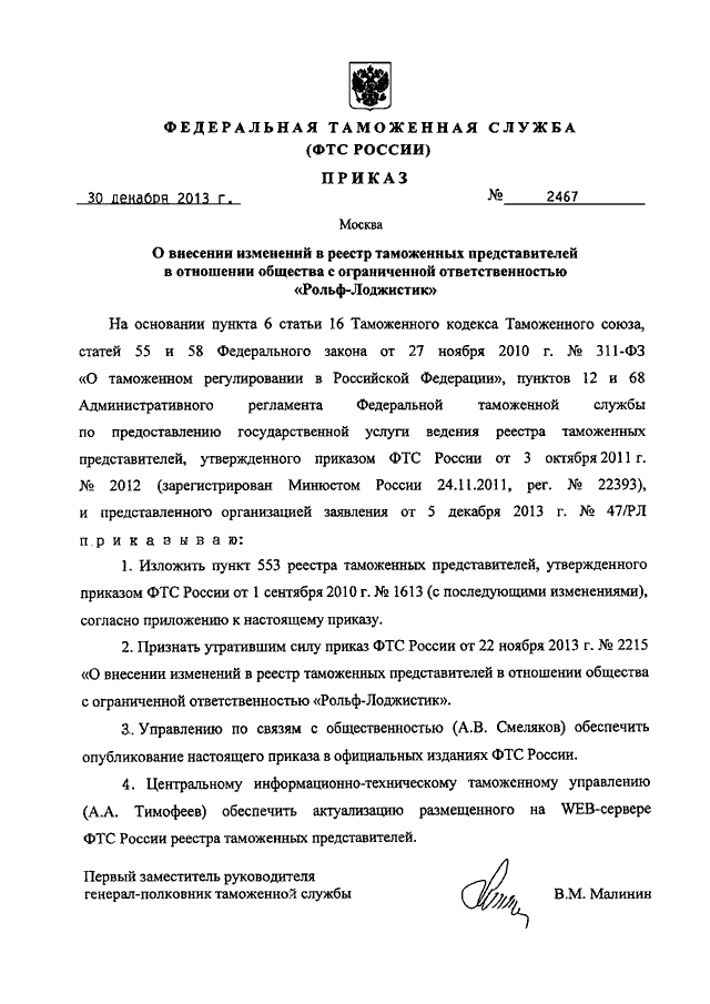 ПРИКАЗ ФТС РФ от 30.12.2013 N 2467