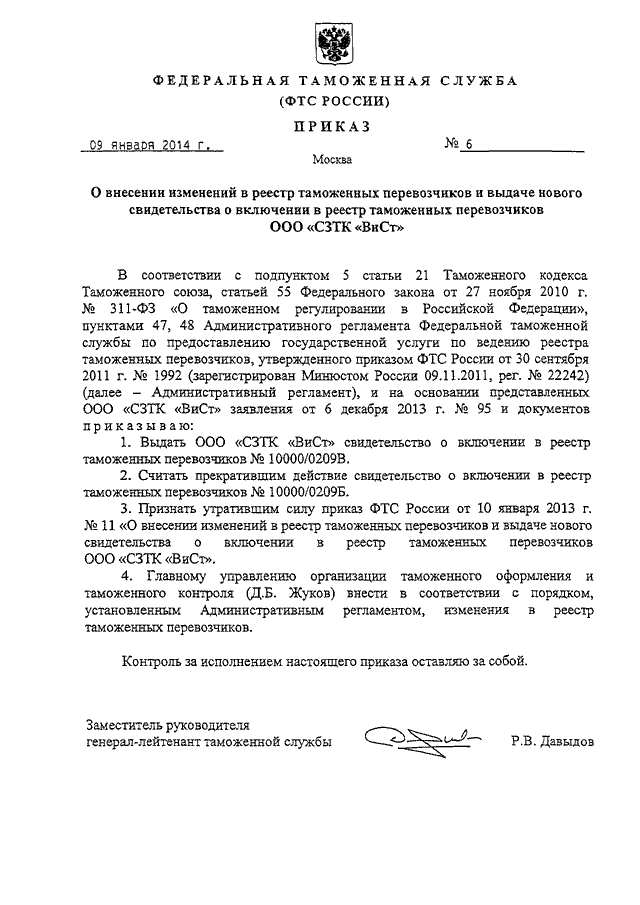 "О ВНЕСЕНИИ ИЗМЕНЕНИЙ В РЕЕСТР ТАМОЖЕННЫХ ПЕРЕВОЗЧИКОВ И ВЫДАЧЕ НОВОГО СВИДЕТЕЛЬСТВА О ВКЛЮЧЕНИИ В РЕЕСТР ТАМОЖЕННЫХ ПЕРЕВОЗЧИКОВ ООО "СЗТК "ВИСТ"