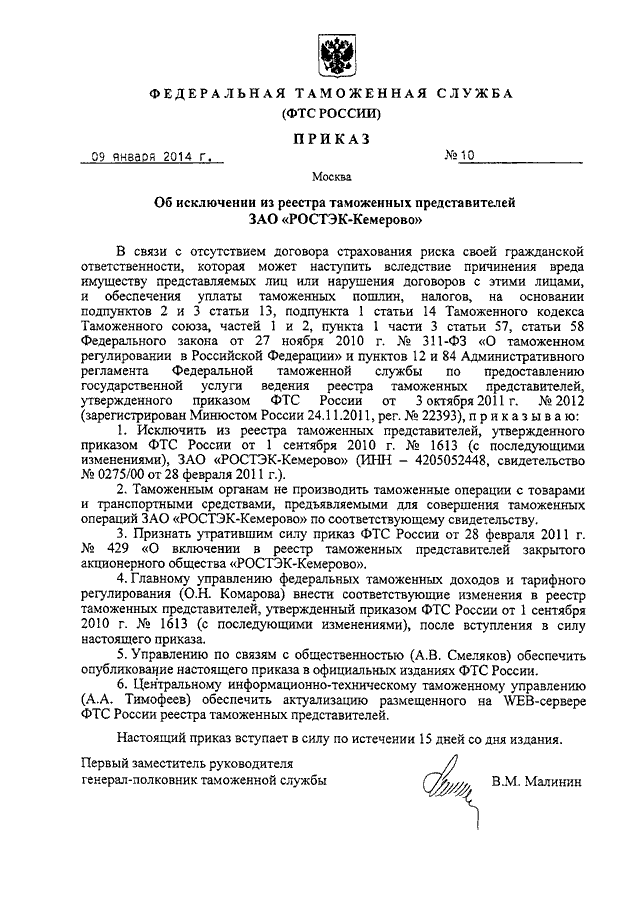 ПРИКАЗ ФТС РФ от 09.01.2014 N 10