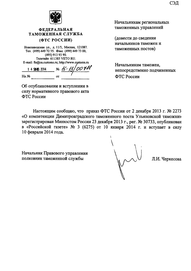 "ОБ ОПУБЛИКОВАНИИ И ВСТУПЛЕНИИ В СИЛУ НОРМАТИВНОГО ПРАВОВОГО АКТА ФТС РОССИИ"