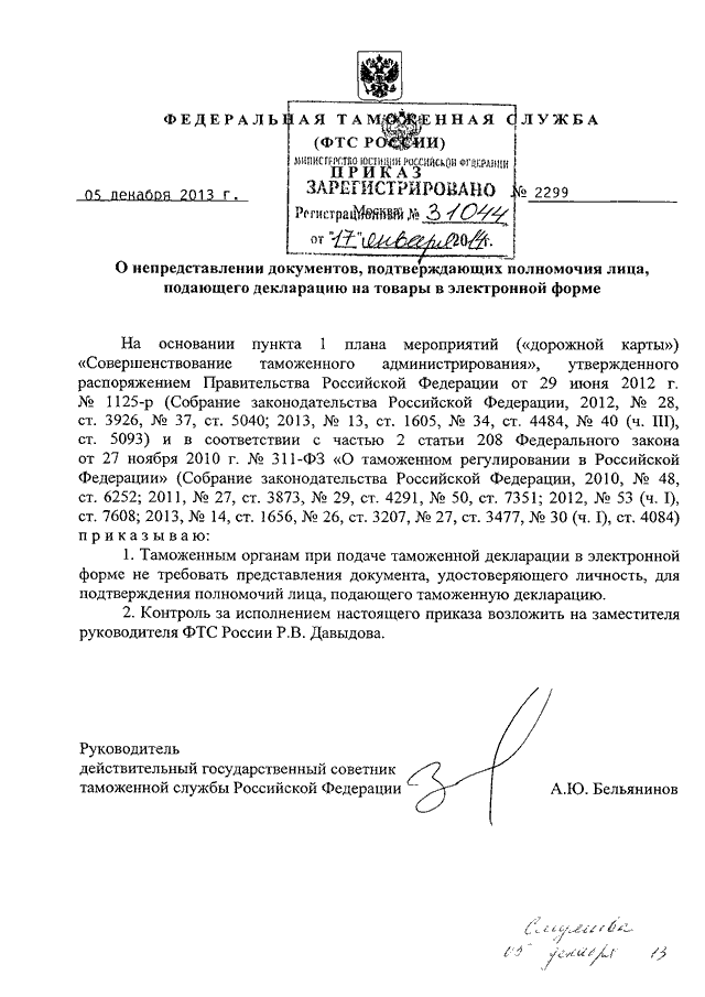 ПРИКАЗ ФТС РФ от 05.12.2013 N 2299