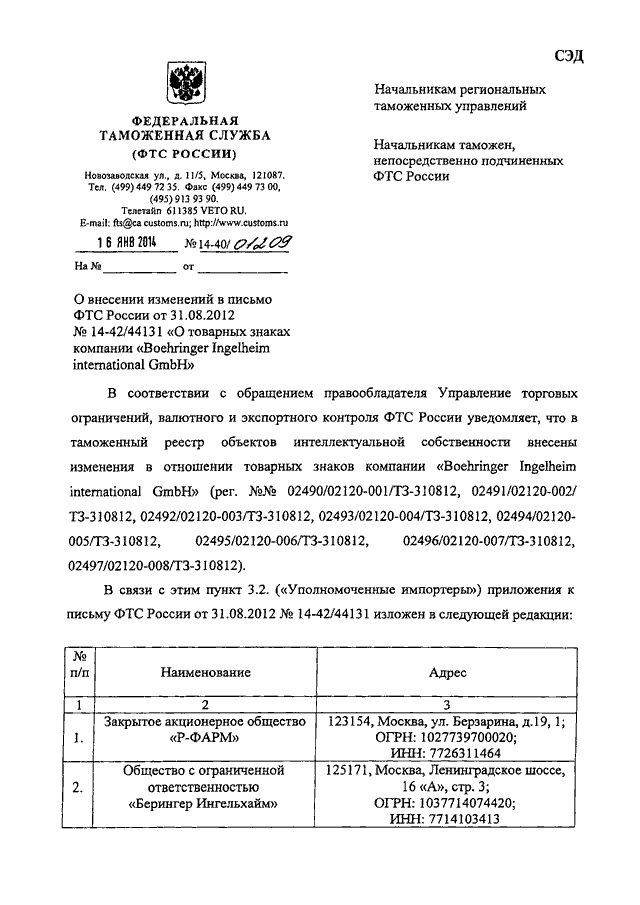 "О ВНЕСЕНИИ ИЗМЕНЕНИЙ В ПИСЬМО ФТС РОССИИ ОТ 31.08.2012 N 14-42/44131 "О ТОВАРНЫХ ЗНАКАХ КОМПАНИИ "BOEHRINGER INGELHEIM INTERNATIONAL GMBH"