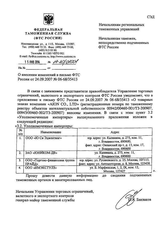 ПИСЬМО ФТС РФ от 15.01.2014 N 14-40/01001