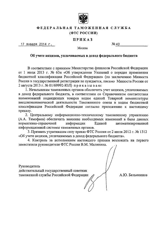 ПРИКАЗ ФТС РФ от 17.01.2014 N 43