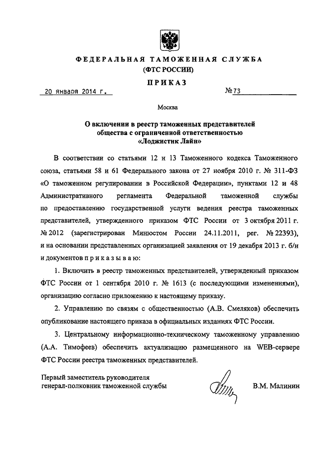 ПРИКАЗ ФТС РФ от 20.01.2014 N 73
