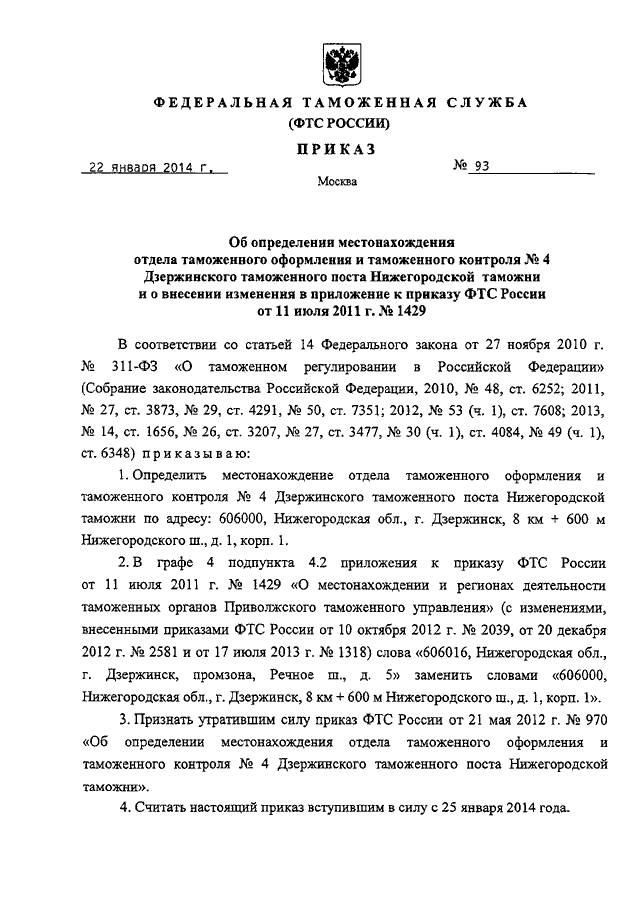 ПРИКАЗ ФТС РФ от 22.01.2014 N 93 "ОБ ОПРЕДЕЛЕНИИ МЕСТОНАХОЖДЕНИЯ ОТДЕЛА ТАМОЖЕННОГО ОФОРМЛЕНИЯ И