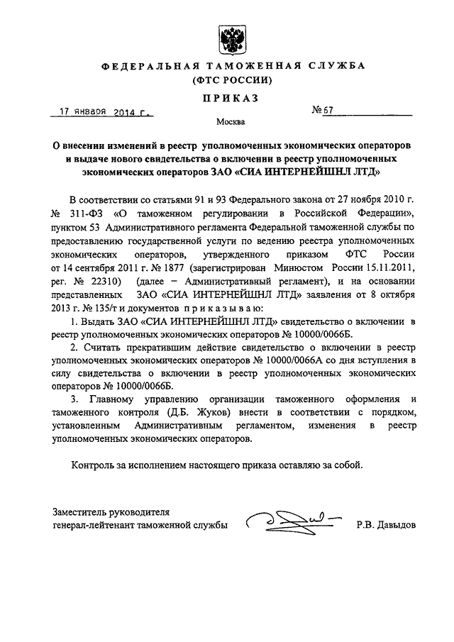 "О ВНЕСЕНИИ ИЗМЕНЕНИЙ В РЕЕСТР УПОЛНОМОЧЕННЫХ ЭКОНОМИЧЕСКИХ ОПЕРАТОРОВ И ВЫДАЧЕ НОВОГО СВИДЕТЕЛЬСТВА О ВКЛЮЧЕНИИ В РЕЕСТР УПОЛНОМОЧЕННЫХ ЭКОНОМИЧЕСКИХ ОПЕРАТОРОВ ЗАО "СИА ИНТЕРНЕЙШНЛ ЛТД"