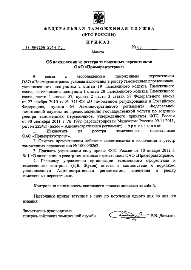 ПРИКАЗ ФТС РФ от 17.01.2014 N 66