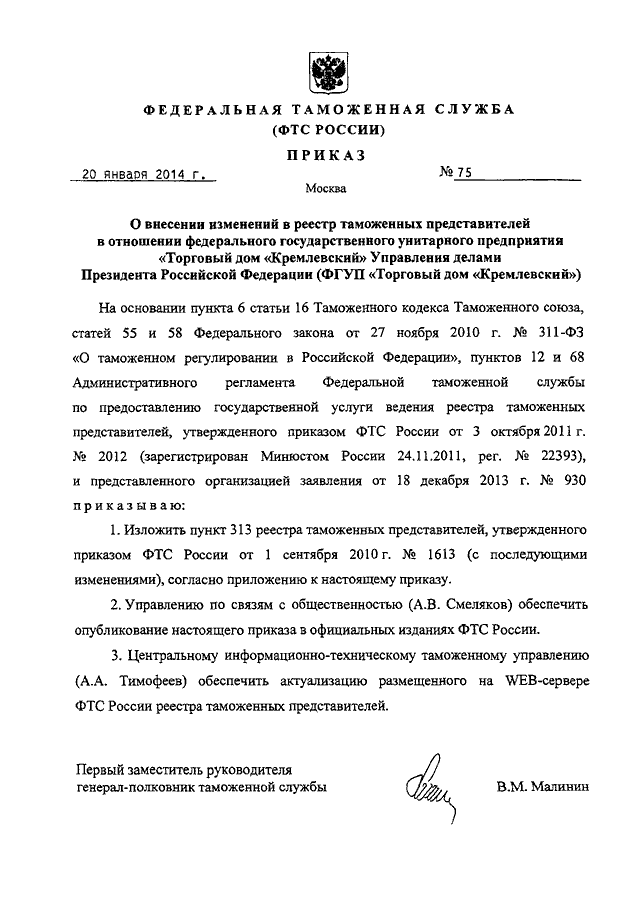 ПРИКАЗ ФТС РФ от 20.01.2014 N 75 "О ВНЕСЕНИИ ИЗМЕНЕНИЙ В РЕЕСТР ТАМОЖЕННЫХ ПРЕДСТАВИТЕЛЕЙ В