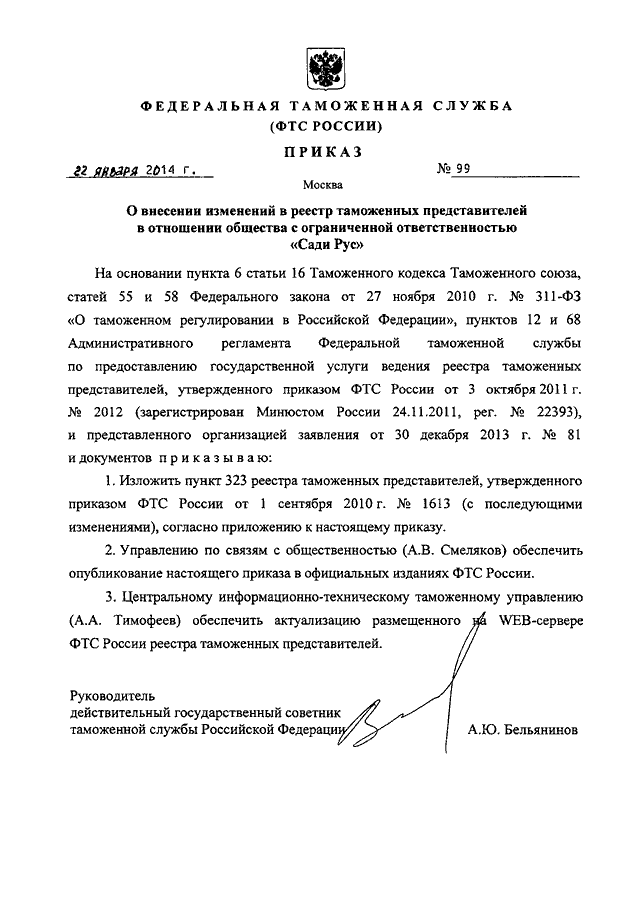 ПРИКАЗ ФТС РФ от 22.01.2014 N 99