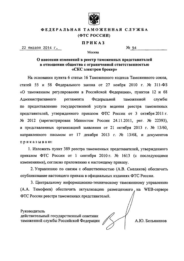 ПРИКАЗ ФТС РФ от 22.01.2014 N 94