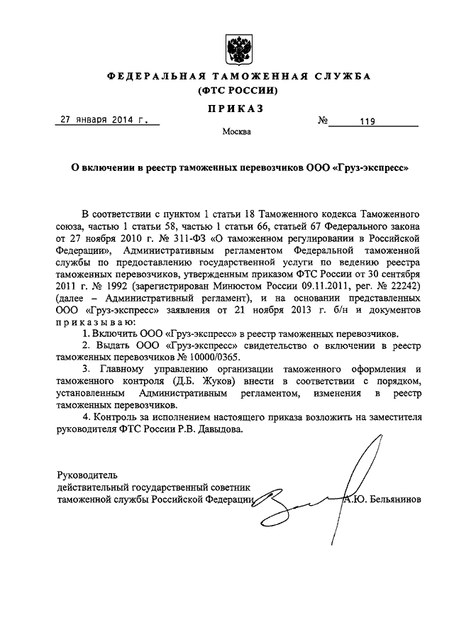 ПРИКАЗ ФТС РФ от 27.01.2014 N 119