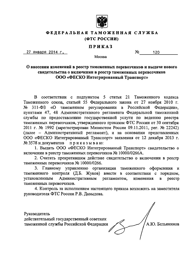 "О ВНЕСЕНИИ ИЗМЕНЕНИЙ В РЕЕСТР ТАМОЖЕННЫХ ПЕРЕВОЗЧИКОВ И ВЫДАЧЕ НОВОГО СВИДЕТЕЛЬСТВА О ВКЛЮЧЕНИИ В РЕЕСТР ТАМОЖЕННЫХ ПЕРЕВОЗЧИКОВ ООО "ФЕСКО ИНТЕГРИРОВАННЫЙ ТРАНСПОРТ"