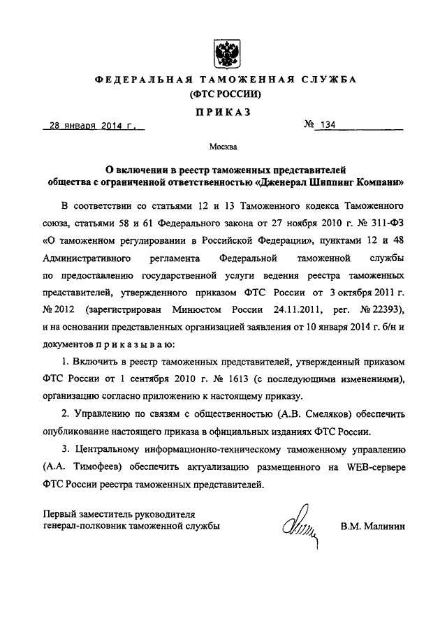 ПРИКАЗ ФТС РФ от 28.01.2014 N 134