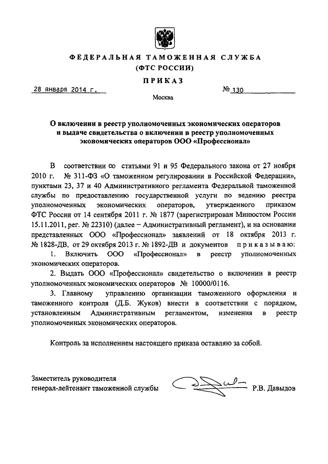 "О ВКЛЮЧЕНИИ В РЕЕСТР УПОЛНОМОЧЕННЫХ ЭКОНОМИЧЕСКИХ ОПЕРАТОРОВ И ВЫДАЧЕ СВИДЕТЕЛЬСТВА О ВКЛЮЧЕНИИ В РЕЕСТР УПОЛНОМОЧЕННЫХ ЭКОНОМИЧЕСКИХ ОПЕРАТОРОВ ООО "ПРОФЕССИОНАЛ"