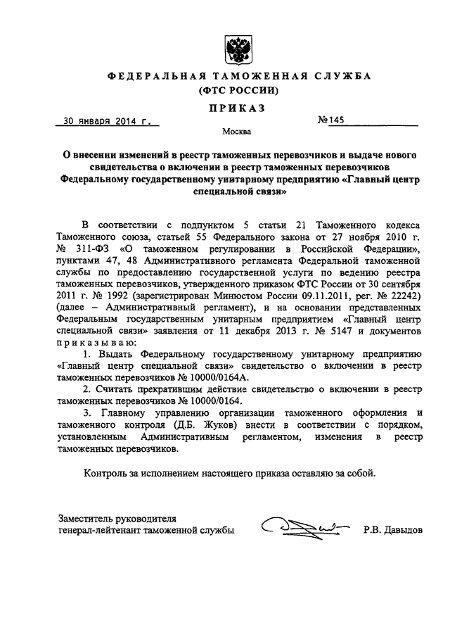 ПРИКАЗ ФТС РФ от 30.01.2014 N 145 "О ВНЕСЕНИИ ИЗМЕНЕНИЙ В РЕЕСТР ТАМОЖЕННЫХ ПЕРЕВОЗЧИКОВ И ВЫДАЧЕ