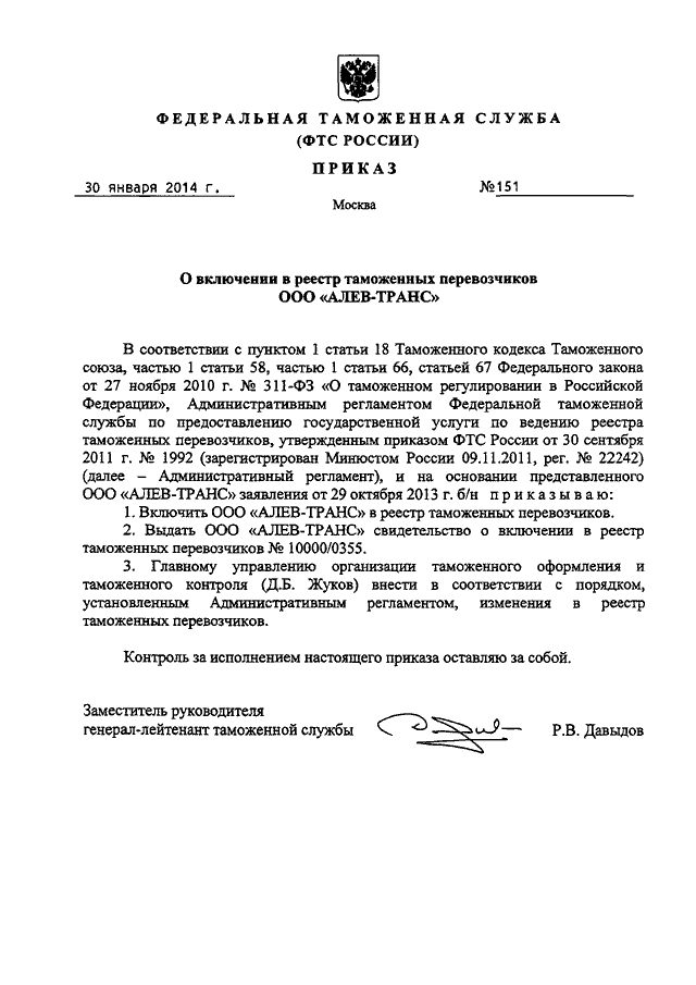 "О ВКЛЮЧЕНИИ В РЕЕСТР ТАМОЖЕННЫХ ПЕРЕВОЗЧИКОВ ООО "АЛЕВ-ТРАНС"