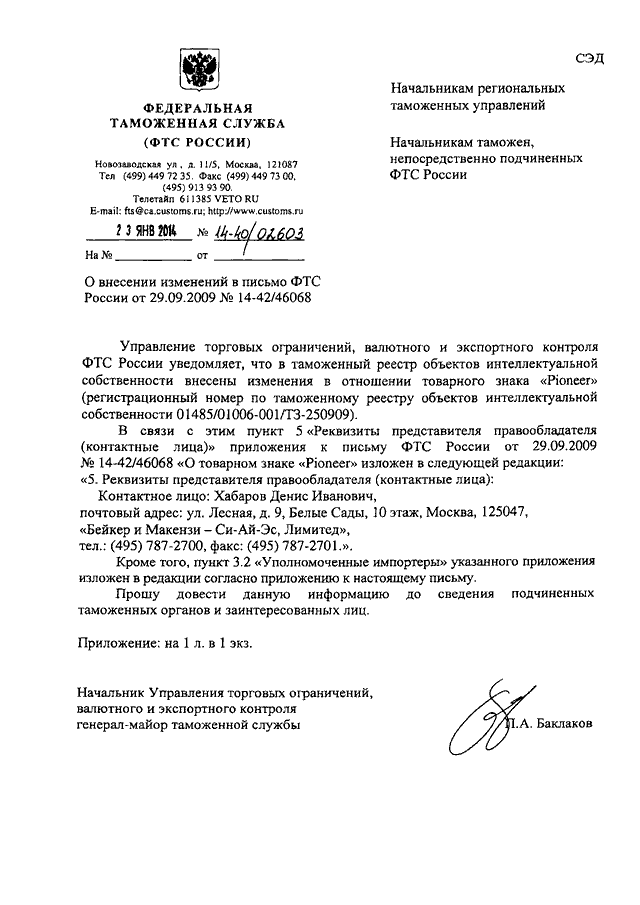 "О ВНЕСЕНИИ ИЗМЕНЕНИЙ В ПИСЬМО ФТС РОССИИ ОТ 29.09.2009 N 14-42/46068"