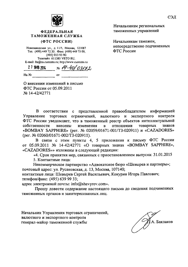 "О ВНЕСЕНИИ ИЗМЕНЕНИЙ В ПИСЬМО ФТС РОССИИ ОТ 05.09.2011 N 14-42/42771"