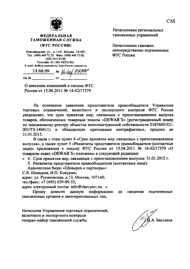 "О ВНЕСЕНИИ ИЗМЕНЕНИЙ В ПИСЬМО ФТС РОССИИ ОТ 15.04.2011 N 14-42/17379"