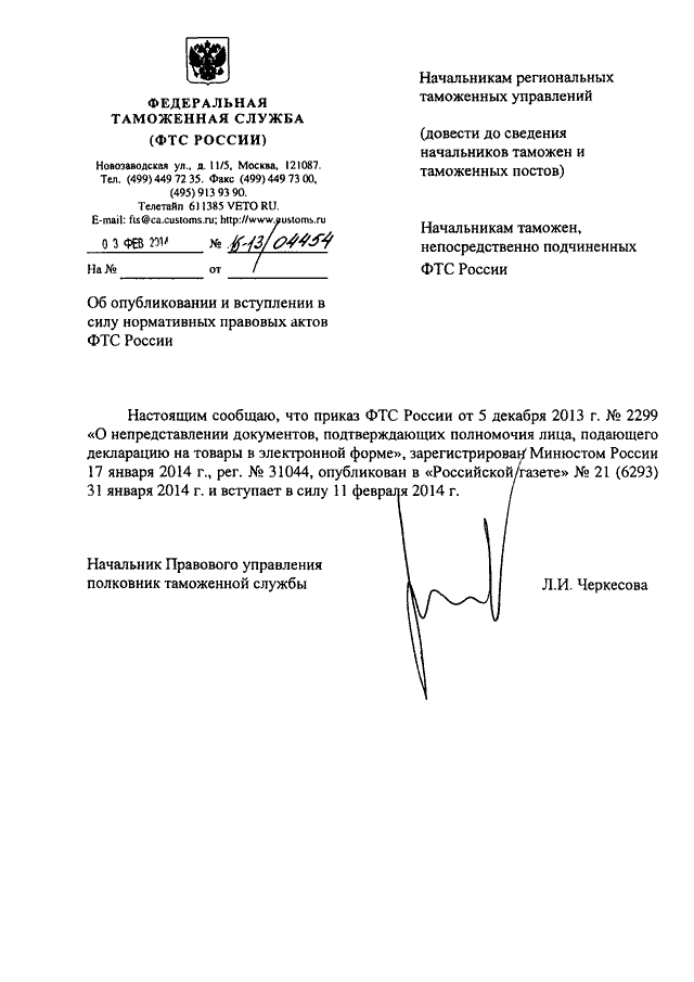 ПИСЬМО ФТС РФ от 03.02.2014 N 15-13/04454