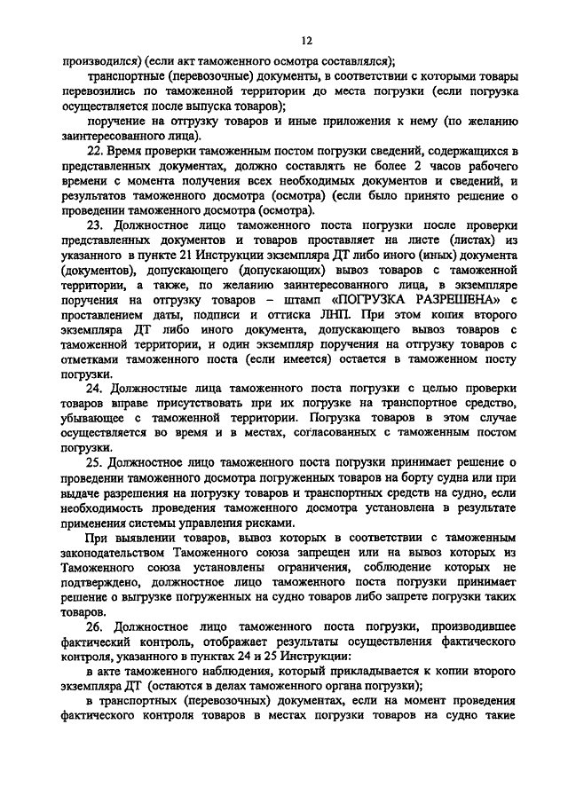 "ОБ УТВЕРЖДЕНИИ ИНСТРУКЦИИ О ДЕЙСТВИЯХ ДОЛЖНОСТНЫХ ЛИЦ ТАМОЖЕННЫХ ОРГАНОВ, СОВЕРШАЮЩИХ ТАМОЖЕННЫЕ ОПЕРАЦИИ И ПРОВОДЯЩИХ ТАМОЖЕННЫЙ КОНТРОЛЬ В ОТНОШЕНИИ СУДОВ, ИСПОЛЬЗУЕМЫХ В ЦЕЛЯХ ТОРГОВОГО МОРЕПЛАВАНИЯ, А ТАКЖЕ ТОВАРОВ И ТРАНСПОРТНЫХ СРЕДСТВ, ПЕРЕМЕЩАЕМЫХ ЧЕРЕЗ ТАМОЖЕННУЮ ГРАНИЦУ ТАМОЖЕННОГО СОЮЗА ЭТИМИ СУДАМИ"