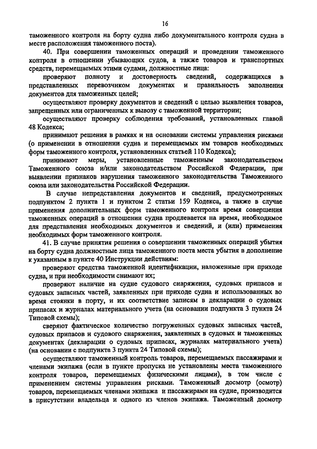 "ОБ УТВЕРЖДЕНИИ ИНСТРУКЦИИ О ДЕЙСТВИЯХ ДОЛЖНОСТНЫХ ЛИЦ ТАМОЖЕННЫХ ОРГАНОВ, СОВЕРШАЮЩИХ ТАМОЖЕННЫЕ ОПЕРАЦИИ И ПРОВОДЯЩИХ ТАМОЖЕННЫЙ КОНТРОЛЬ В ОТНОШЕНИИ СУДОВ, ИСПОЛЬЗУЕМЫХ В ЦЕЛЯХ ТОРГОВОГО МОРЕПЛАВАНИЯ, А ТАКЖЕ ТОВАРОВ И ТРАНСПОРТНЫХ СРЕДСТВ, ПЕРЕМЕЩАЕМЫХ ЧЕРЕЗ ТАМОЖЕННУЮ ГРАНИЦУ ТАМОЖЕННОГО СОЮЗА ЭТИМИ СУДАМИ"