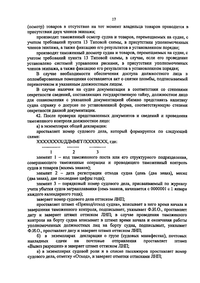 "ОБ УТВЕРЖДЕНИИ ИНСТРУКЦИИ О ДЕЙСТВИЯХ ДОЛЖНОСТНЫХ ЛИЦ ТАМОЖЕННЫХ ОРГАНОВ, СОВЕРШАЮЩИХ ТАМОЖЕННЫЕ ОПЕРАЦИИ И ПРОВОДЯЩИХ ТАМОЖЕННЫЙ КОНТРОЛЬ В ОТНОШЕНИИ СУДОВ, ИСПОЛЬЗУЕМЫХ В ЦЕЛЯХ ТОРГОВОГО МОРЕПЛАВАНИЯ, А ТАКЖЕ ТОВАРОВ И ТРАНСПОРТНЫХ СРЕДСТВ, ПЕРЕМЕЩАЕМЫХ ЧЕРЕЗ ТАМОЖЕННУЮ ГРАНИЦУ ТАМОЖЕННОГО СОЮЗА ЭТИМИ СУДАМИ"