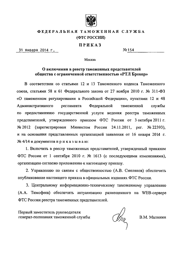 ПРИКАЗ ФТС РФ от 31.01.2014 N 154
