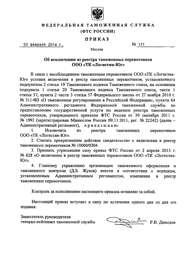 ПРИКАЗ ФТС РФ от 03.02.2014 N 171