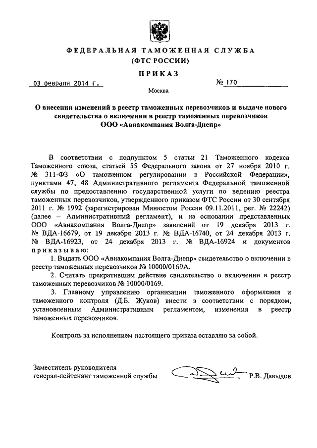 ПРИКАЗ ФТС РФ от 03.02.2014 N 170