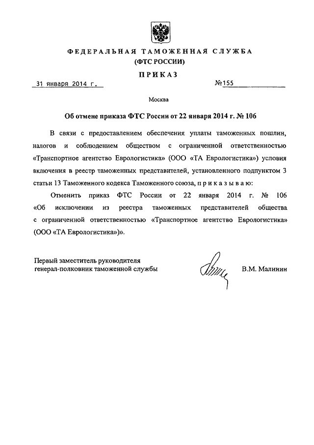 "ОБ ОТМЕНЕ ПРИКАЗА ФТС РОССИИ ОТ 22 ЯНВАРЯ 2014 Г. N 106"