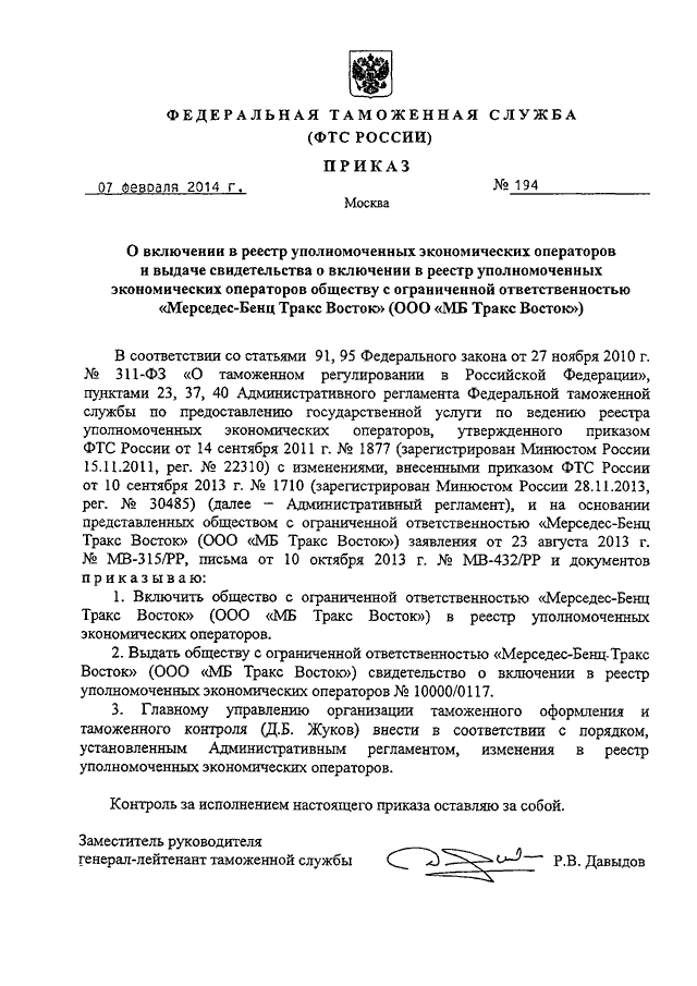 ПРИКАЗ ФТС РФ от 07.02.2014 N 194 "О ВКЛЮЧЕНИИ В РЕЕСТР УПОЛНОМОЧЕННЫХ ЭКОНОМИЧЕСКИХ ОПЕРАТОРОВ И