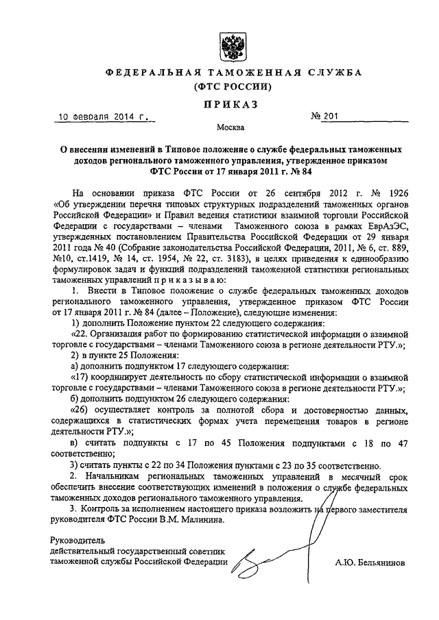 ПРИКАЗ ФТС РФ от 10.02.2014 N 201