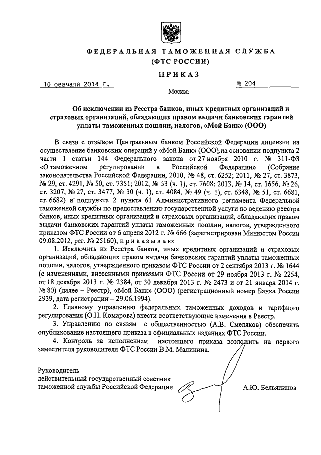 ПРИКАЗ ФТС РФ от 10.02.2014 N 204